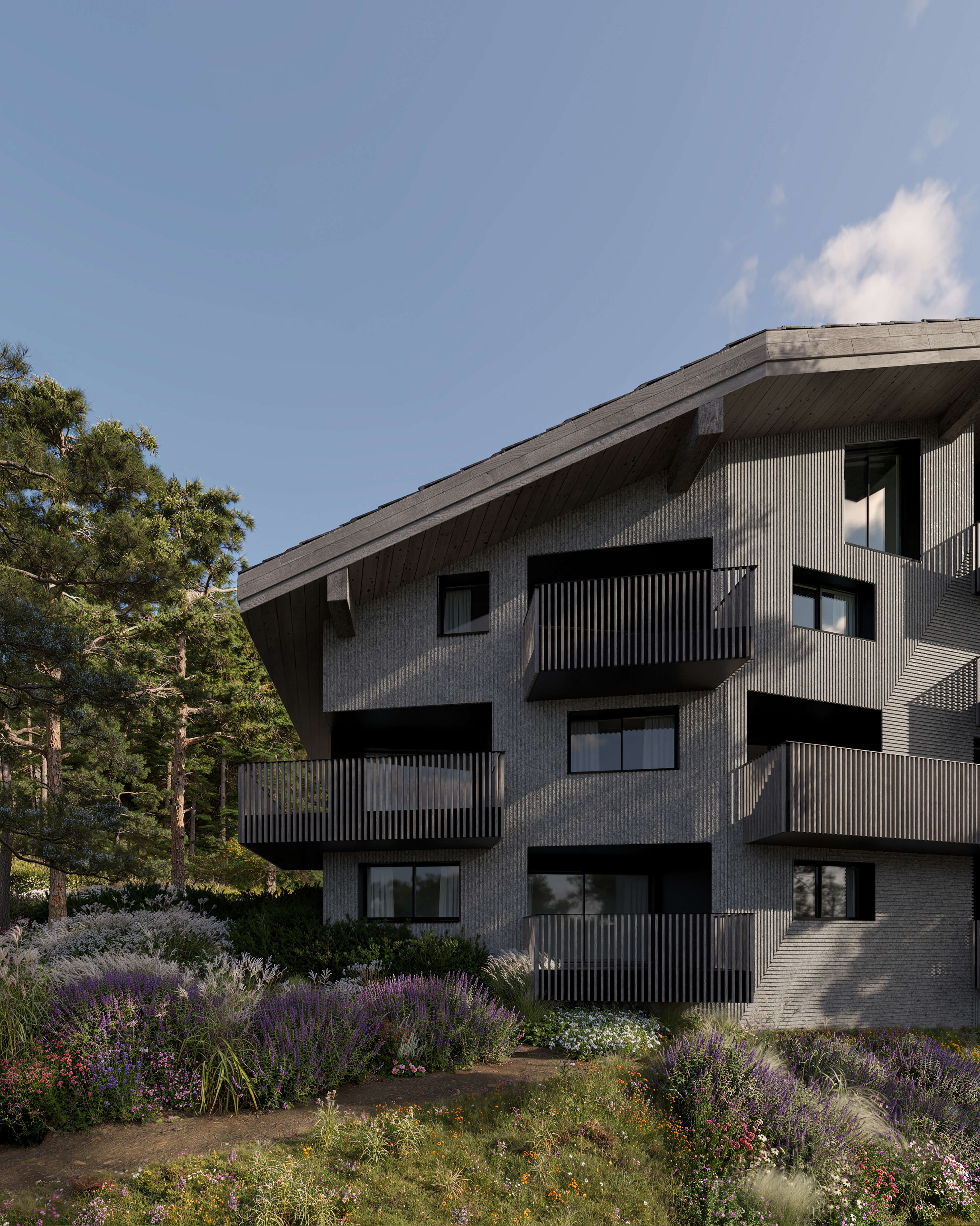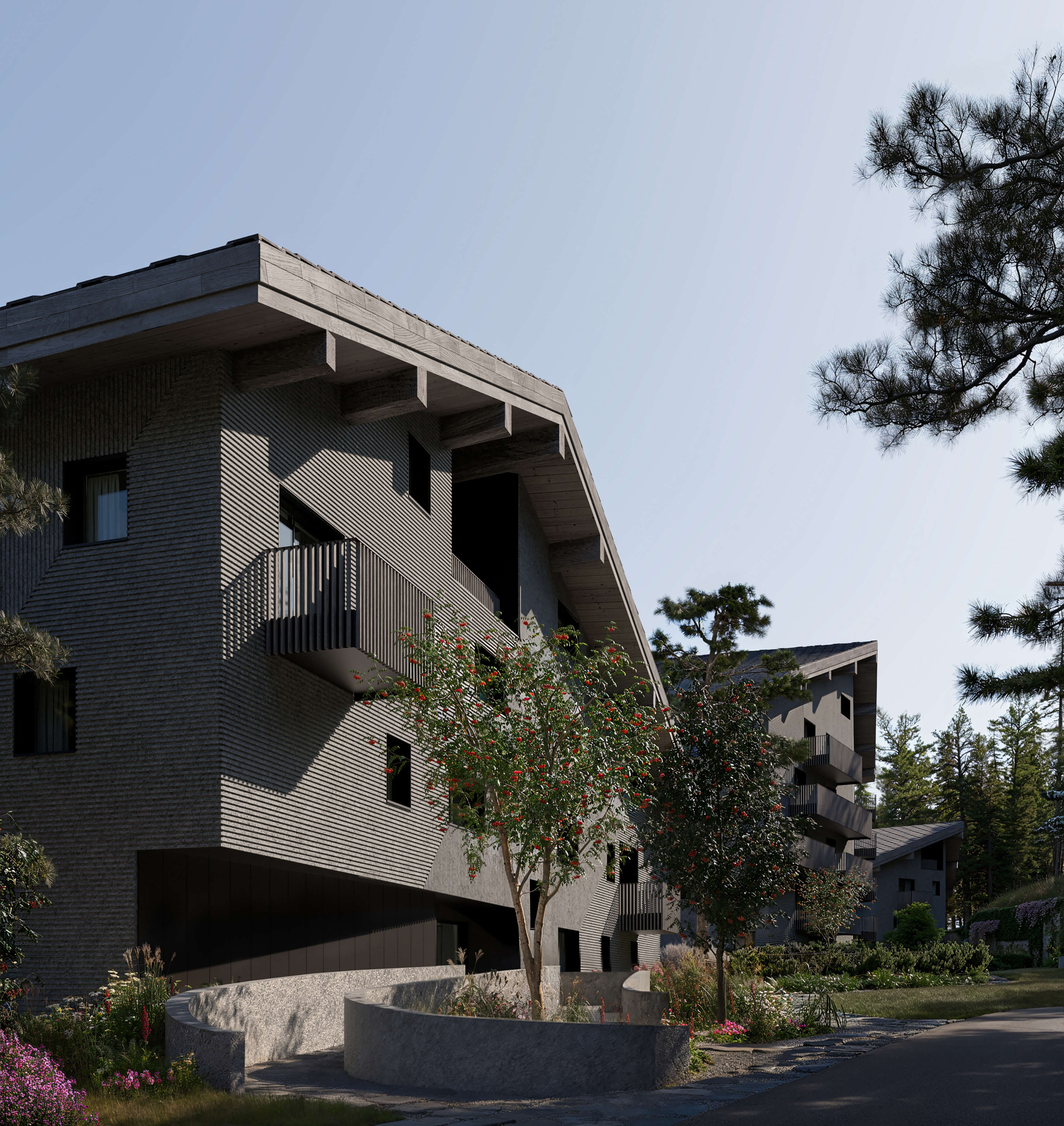Enea Landscape Architecture, renowned for its focus on harmonizing architecture with nature, masterfully integrates the property into its surrounding landscape, providing a picturesque backdrop for every season. The concept of ’natural edges’ is carried throughout the property. Evergreen Scots pines and common hornbeam trees are methodically placed around each of the three buildings, blending seamlessly with the adjacent forest in hues of infinite autumn and rejuvenating spring. All the while, other native tree and plant species cleverly enhance mountain views, ensuring a sense of continuity and place, while climbing vines soften architectural elements and gravel paths –employing the same natural stone of the façades – meander through a meadow of wildflowers.