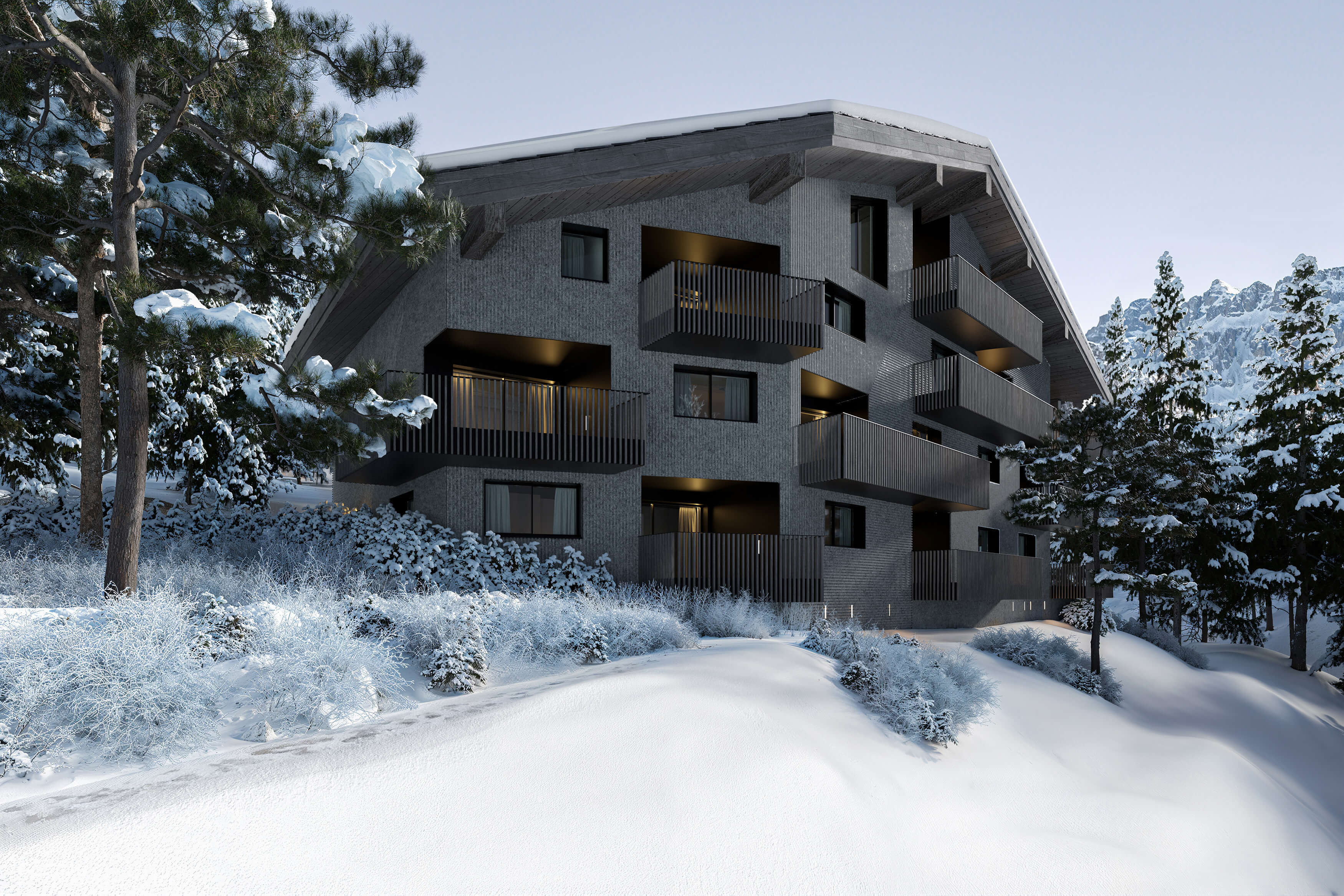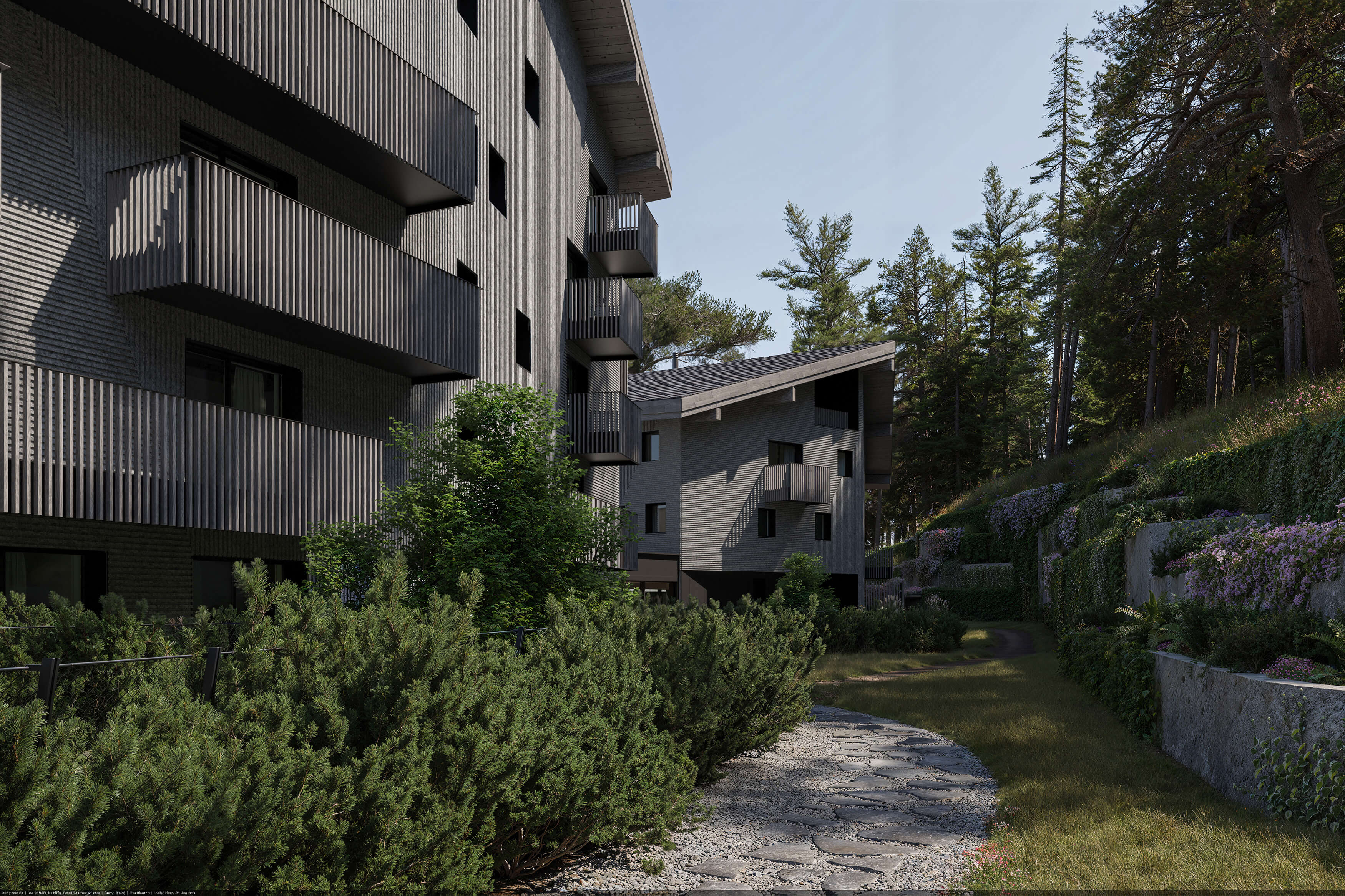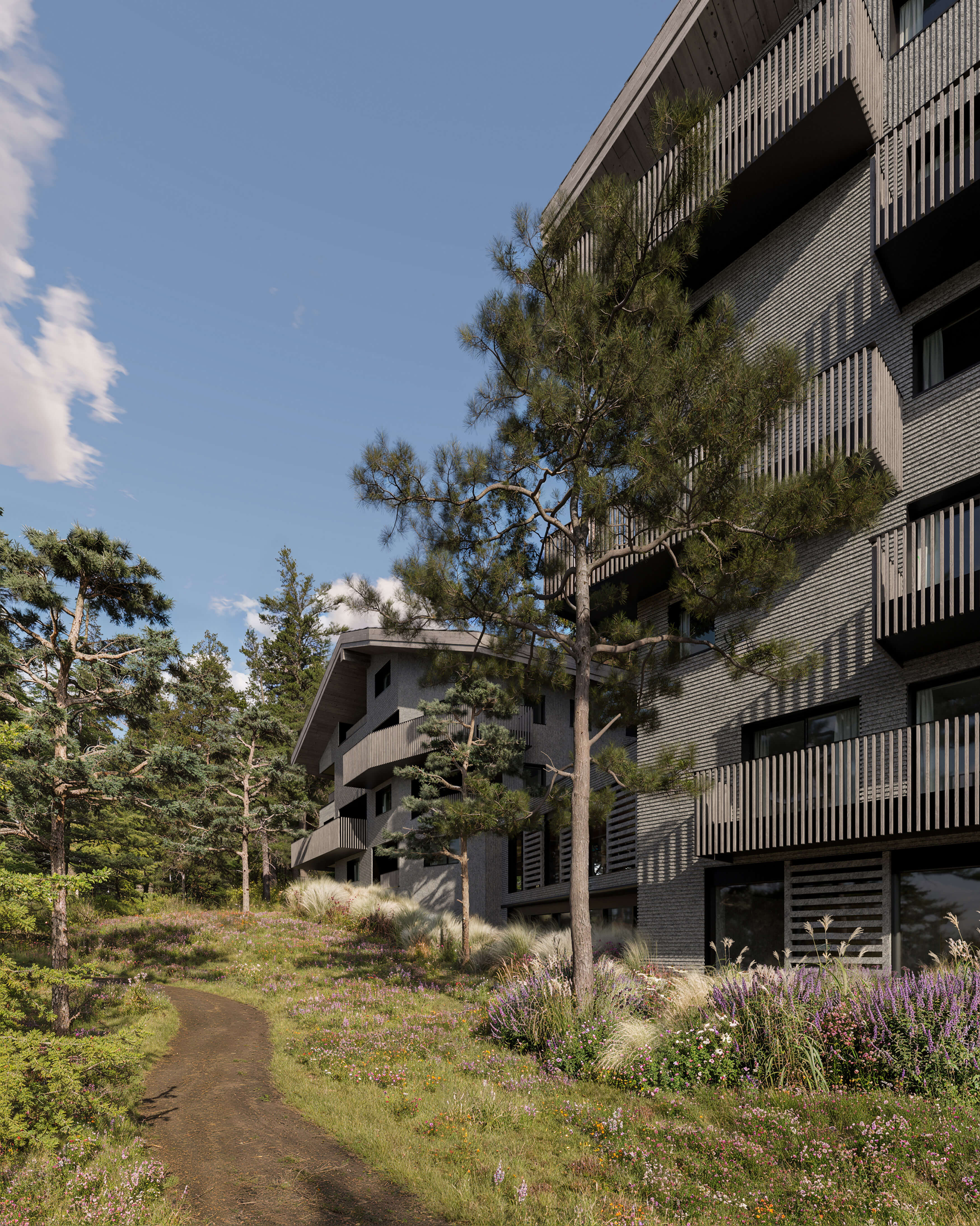 Through fusing the project’s site into the spirit of the existing place, the site’s ecotone is enhanced, presenting an environment where the forest meets the alpine meadow and where humans integrate with nature, creating habitats for small animals, birds, butterflies and bees, fostering the local biodiversity. Inviting residents to linger in the landscape both inside and out, the presence of natural elements is felt throughout the compound from benches along walking paths to a spa area that’s seemingly carved directly into the surrounding rock as if it was and has always been there waiting for you.